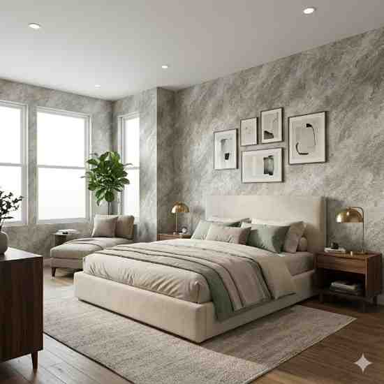 This wallpaper features a soft mineral-inspired texture with a delicate speckled pattern and gentle diagonal surface movement. The design creates a calm and balanced visual effect suitable for modern interior spaces. The subtle layered grain gives the wall surface a refined stone-like appearance, adding depth without overpowering the room. Its understated pattern blends easily with contemporary furniture and minimalist décor styles. Crafted using vinyl coating with eco-friendly paper backing, the wallpaper offers durability along with a smooth matte finish. The material ensures a clean, elegant wall surface while remaining practical for everyday interiors.