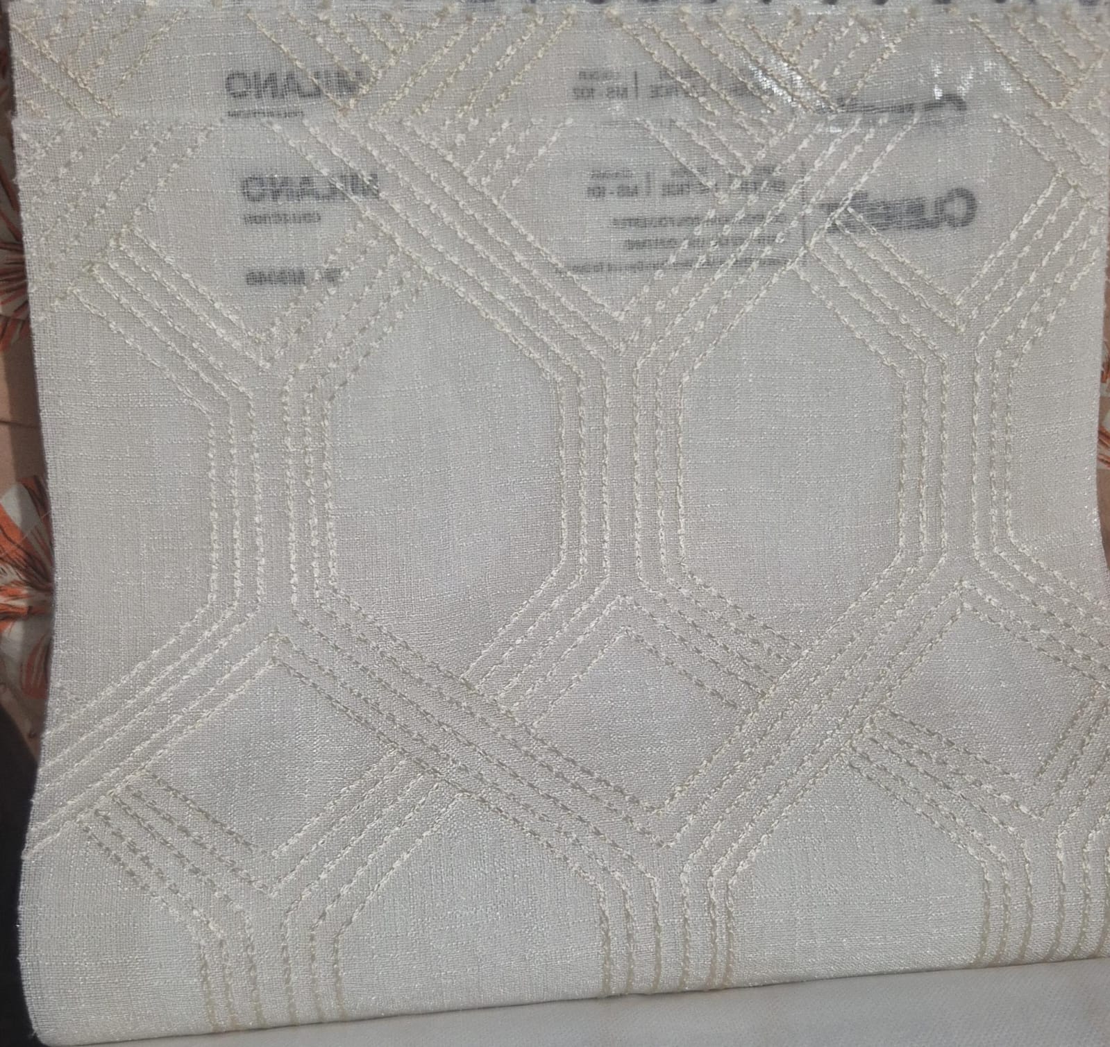 This fabric showcases a structured geometric lattice pattern embroidered across a fine sheer base. The interconnected angular lines form a contemporary trellis layout, creating depth and architectural elegance while maintaining a clean and minimal white appearance. The texture feels light and airy with softly raised stitched lines that add subtle dimension without heaviness. Its sheer quality allows natural light to filter gently through, making it ideal for graceful curtain drapes and equally suitable for decorative cushion covers that complement modern interiors. Crafted from 100% polyester, this sheer fabric ensures durability, easy maintenance, and long-lasting brightness. It performs beautifully as both curtain fabric and cushion fabric in premium living spaces. Colour shade may vary from dye lot to dye lot, and fabric appearance in images may differ from the actual material. For accurate colour and texture confirmation, customers are advised to order a fabric sample before making a final decision.