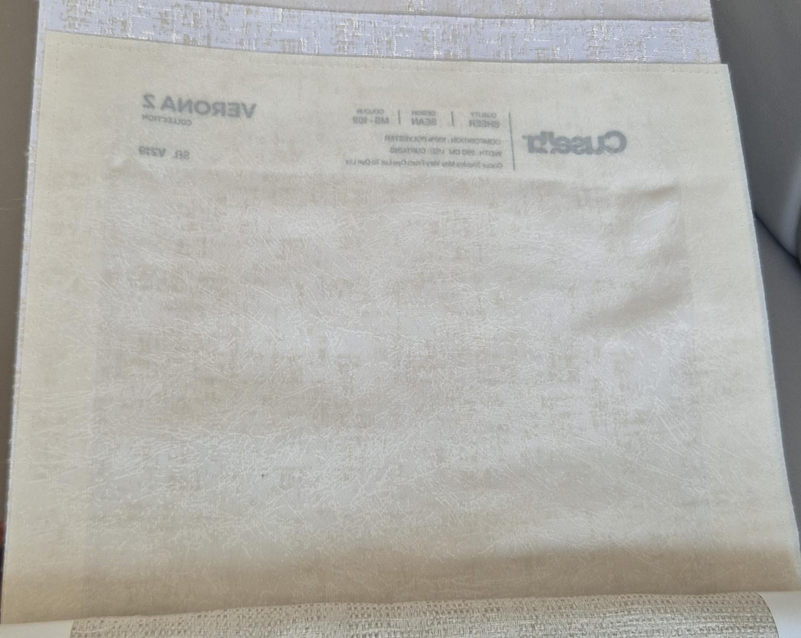 The Verona 2 SEAN in Off White showcases an organic vein-inspired self-textured pattern that resembles delicate natural marble lines spread softly across the surface. The design is subtle yet visible, creating a refined abstract texture that enhances the fabric’s contemporary appeal. Its sheer base allows light to pass through gracefully, while the soft matte finish gives it a smooth and airy feel. The fabric falls effortlessly, making it ideal for elegant curtain drapes and coordinated cushion covers that require a lightweight yet structured look. Crafted from 100% polyester, this fabric offers durability, shape retention, and easy maintenance, making it suitable for modern homes. Colour shade may vary from dye lot to dye lot, and fabric appearance in images may differ from the actual material. For accurate colour and texture confirmation, customers are advised to order a fabric sample.