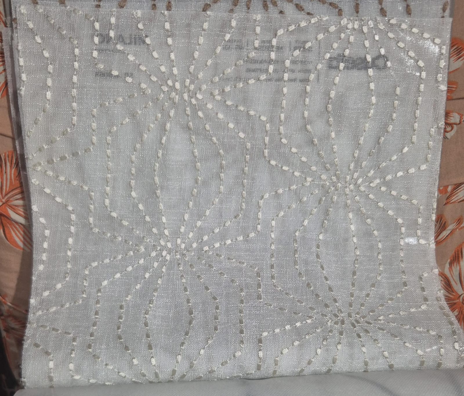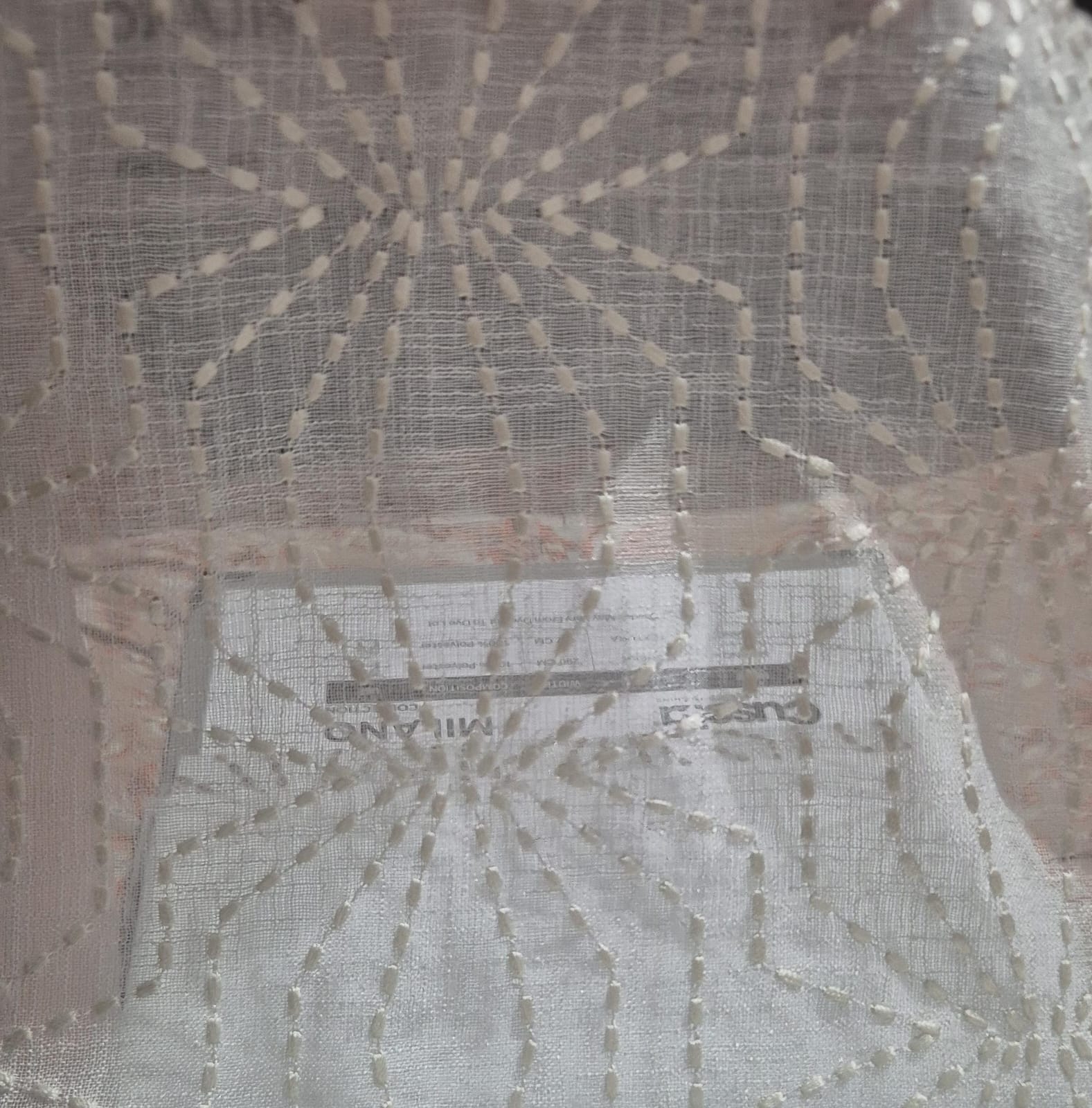 This fabric showcases a striking radiating geometric network pattern formed with closely spaced embroidered stitches. The design creates starburst-like formations connected across the surface, giving the fabric a structured yet artistic character. The warm brown embroidery contrasts beautifully against the soft sheer base, offering refined visual depth. The texture feels light and airy while the raised stitched detailing adds a subtle structured touch. The sheer foundation allows natural light to filter through gracefully, making it ideal for flowing curtains. It also works effectively for decorative cushion covers, adding pattern interest without overwhelming the space. Crafted from 100% polyester, this sheer fabric ensures durability, easy maintenance, and long-lasting colour clarity. It is suitable for both curtain fabric and cushion fabric applications in contemporary interiors. Colour shade may vary from dye lot to dye lot, and fabric appearance in images may differ from the actual material. For accurate colour and texture confirmation, customers are advised to order a fabric sample before final selection.