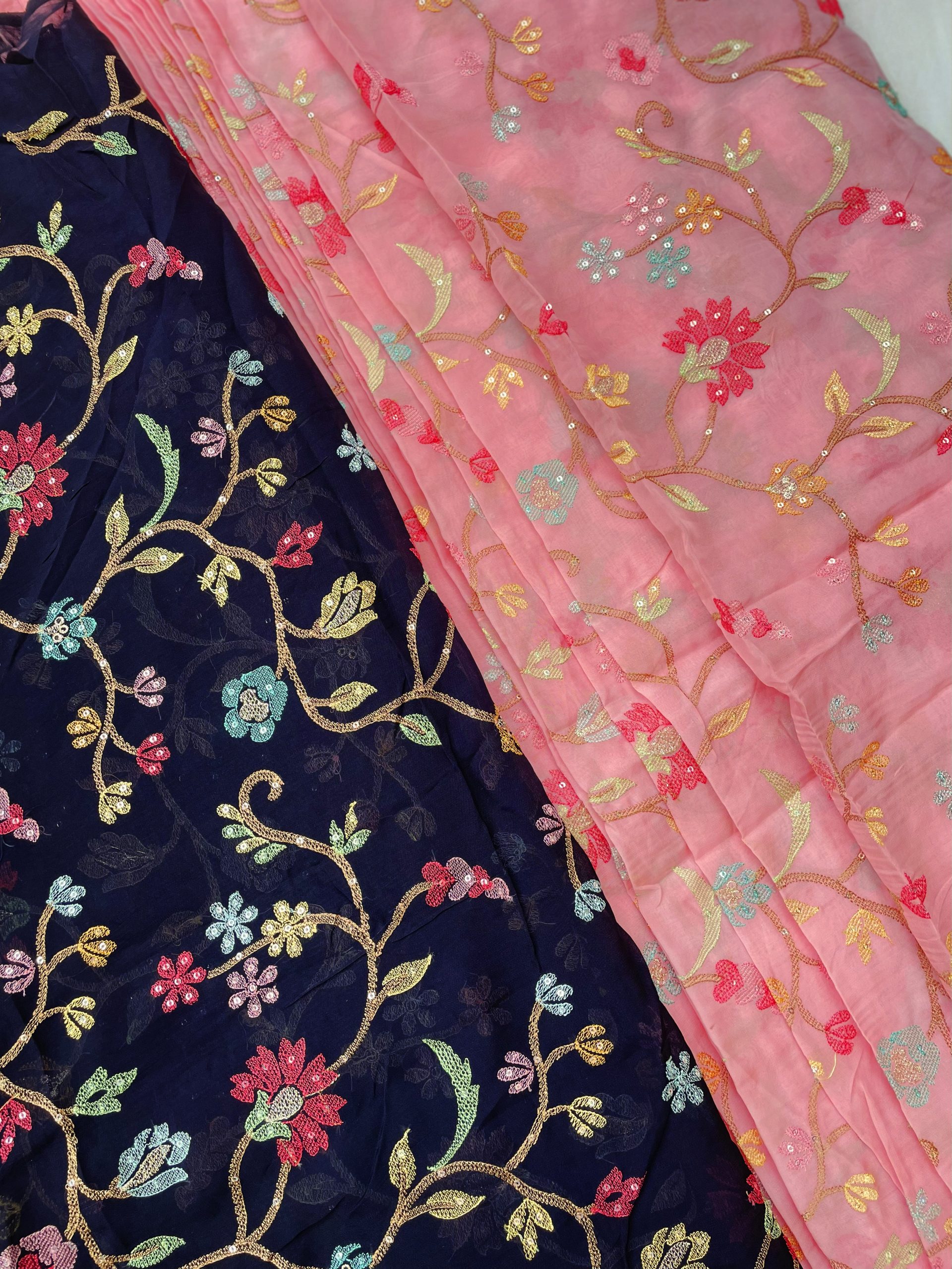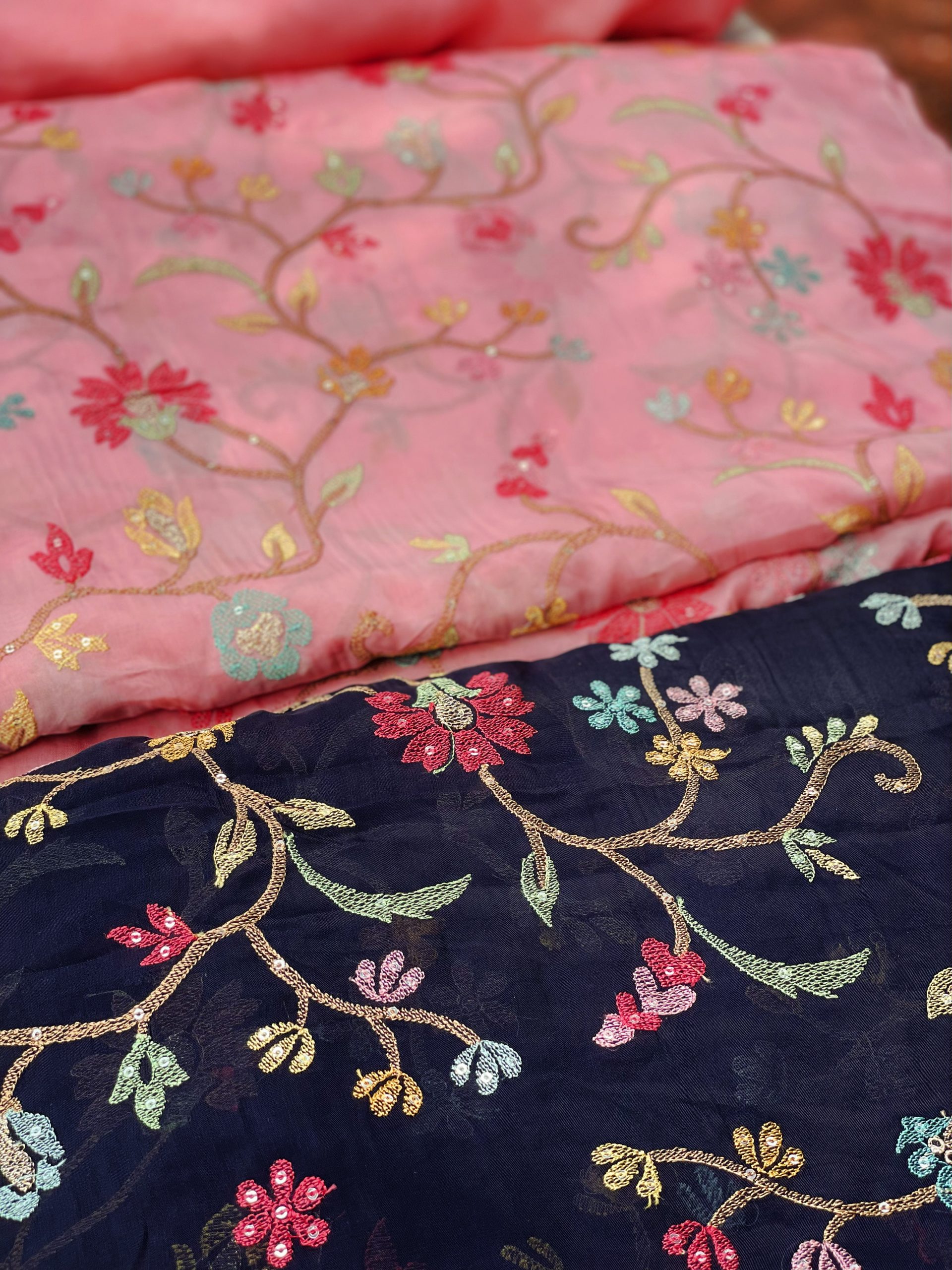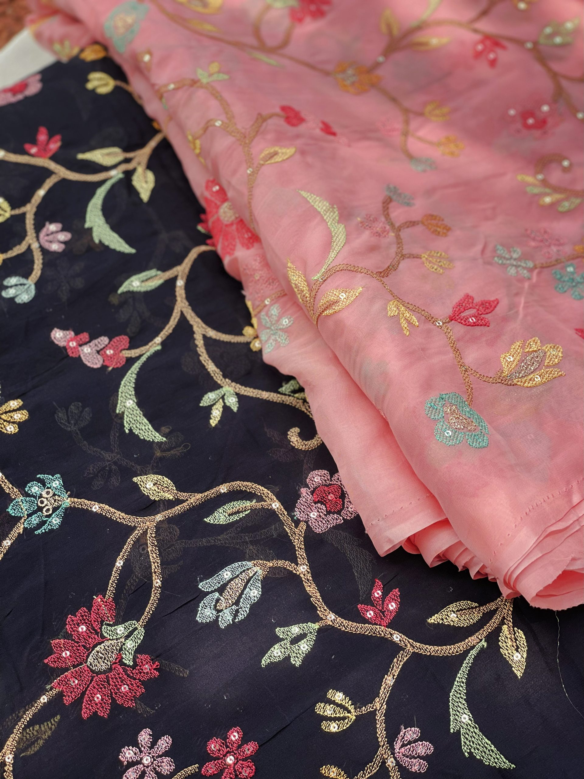 Design: Allover floral embroidery in vibrant threadwork with shimmering sequins for added glamour