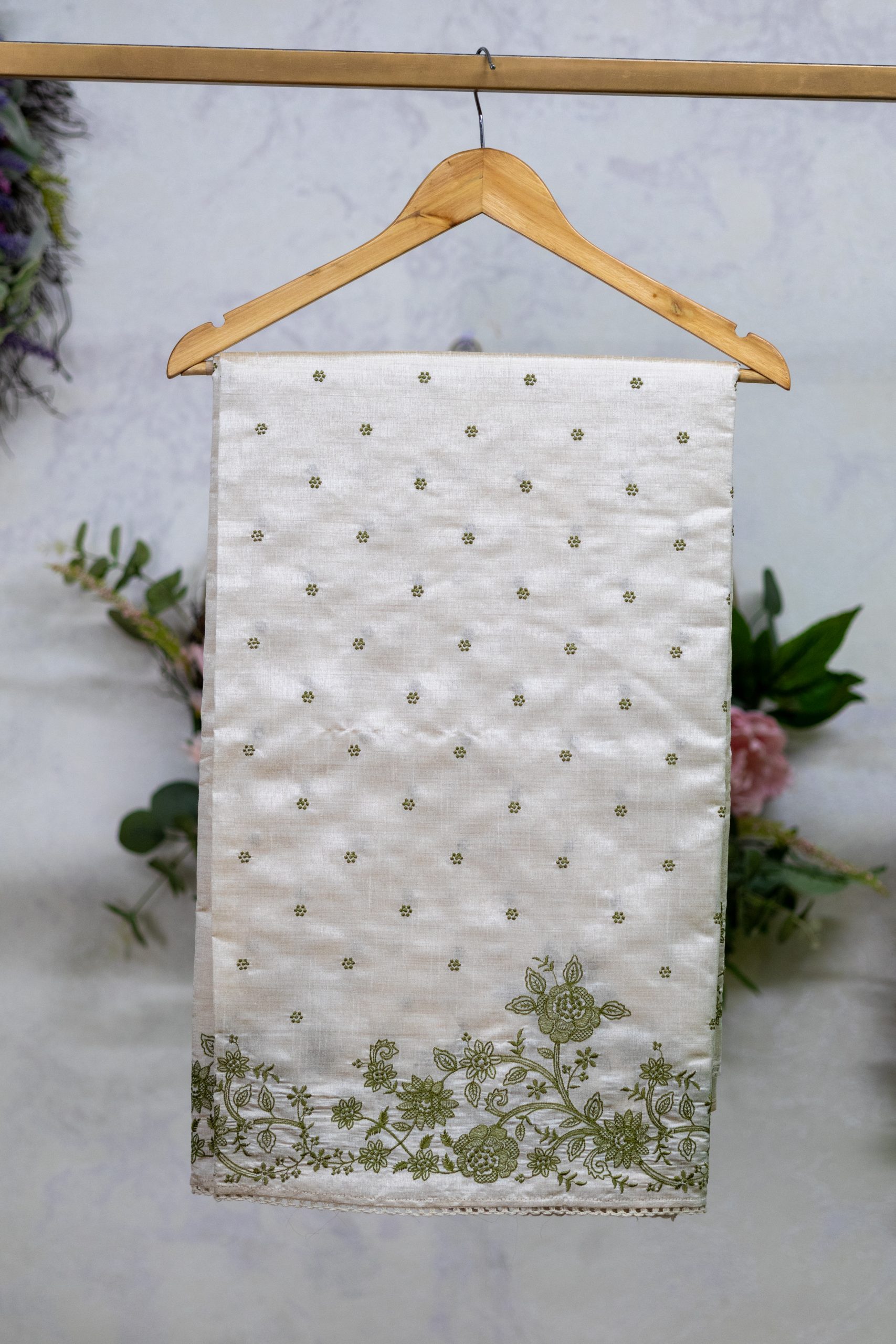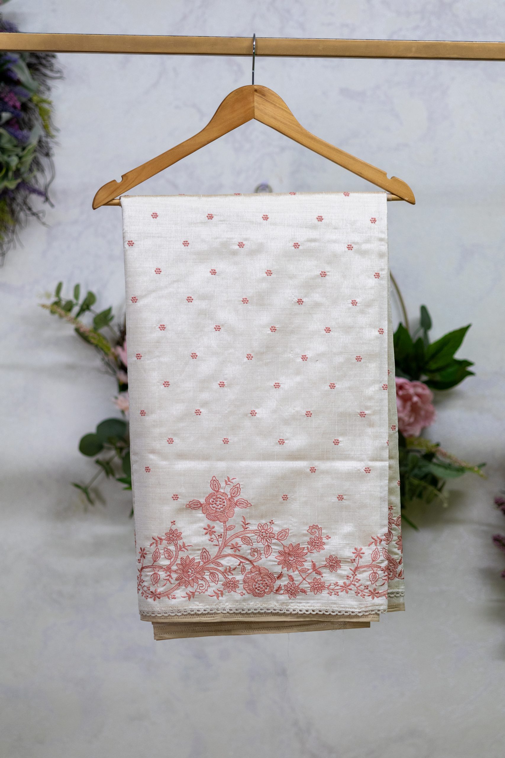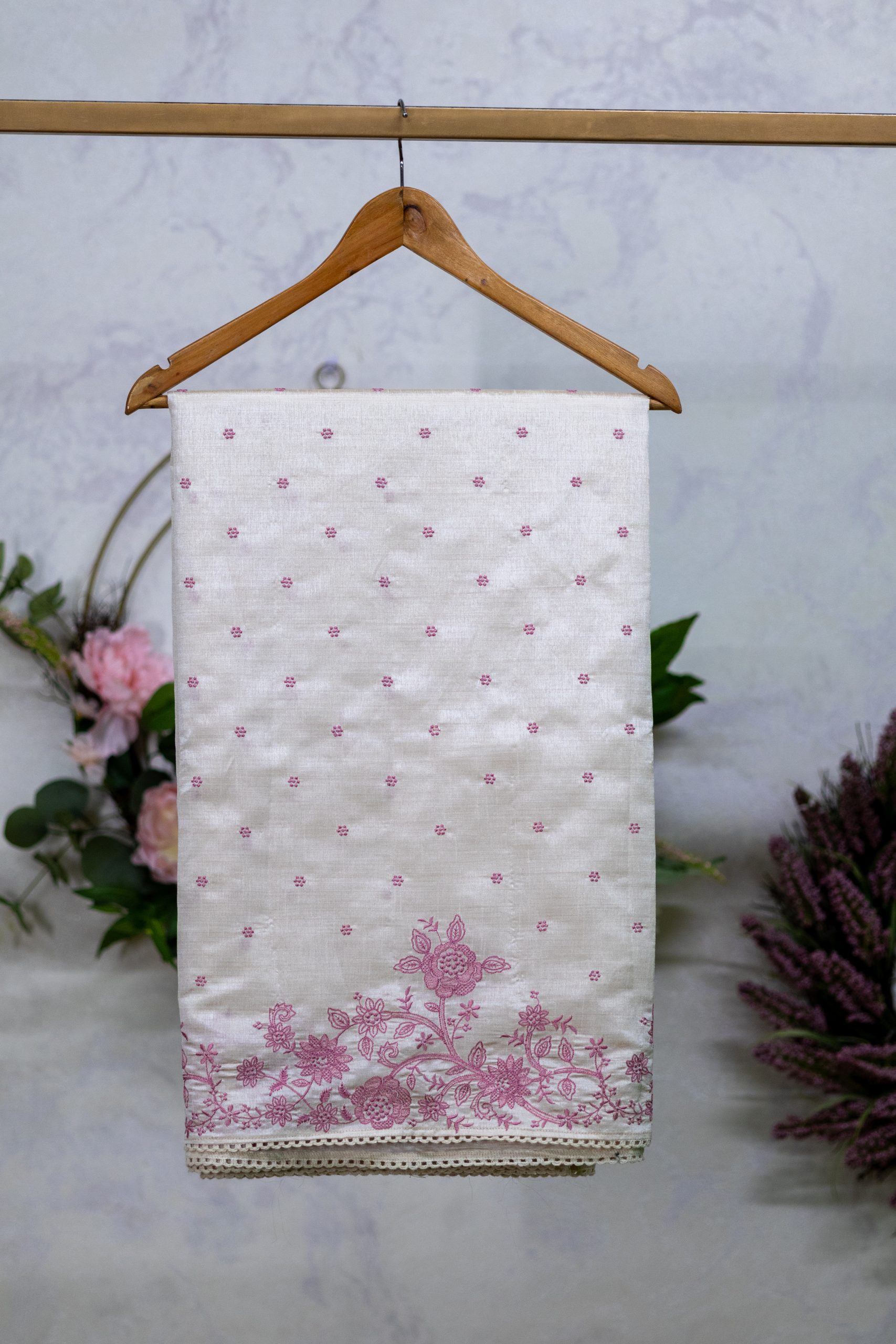 Design: Allover embroidered motifs with lace border; includes matching blouse piece