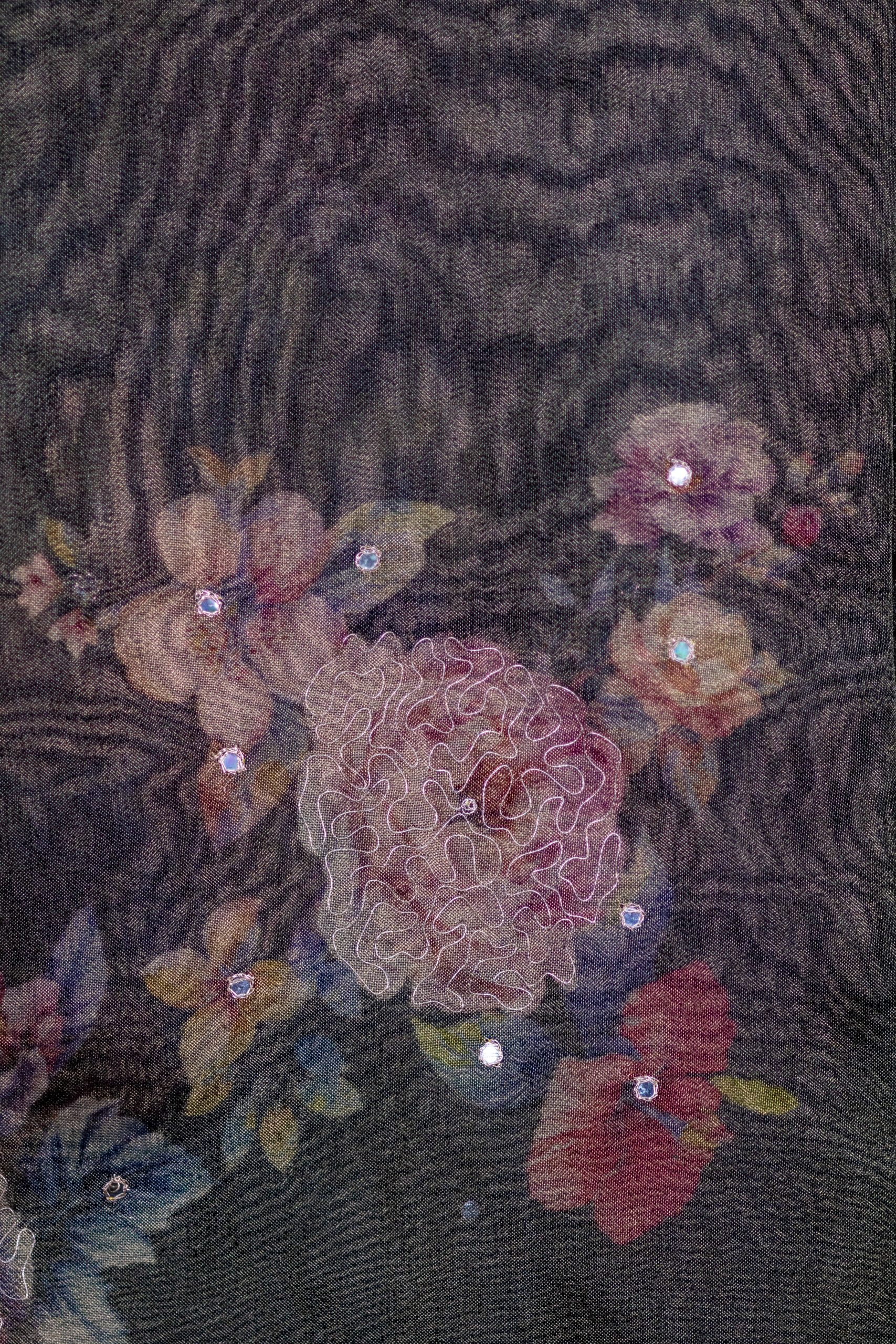 Design: Digital floral print enhanced with hand-embroidered embellishments; scalloped edges for added charm
